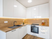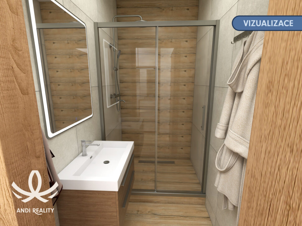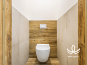Nová koupelna s prostorným sprchovým koutem, umyvadlem a zrcadlem. Vše dělané v příjemném dekoru dřeva. Sprchový kout nabízí dostatek prostoru. Toaleta oddělená od koupelny, ale ve stejném dekoru, aby vše ladilo. Kuchyňský kout je řešený prakticky, vybavený myčkou, troubou, varnou deskou a digestoří. Pro dosažení maximálního úložného prostoru jsou horní skříňky až ke stropu. To působí kompaktně a elegantně.