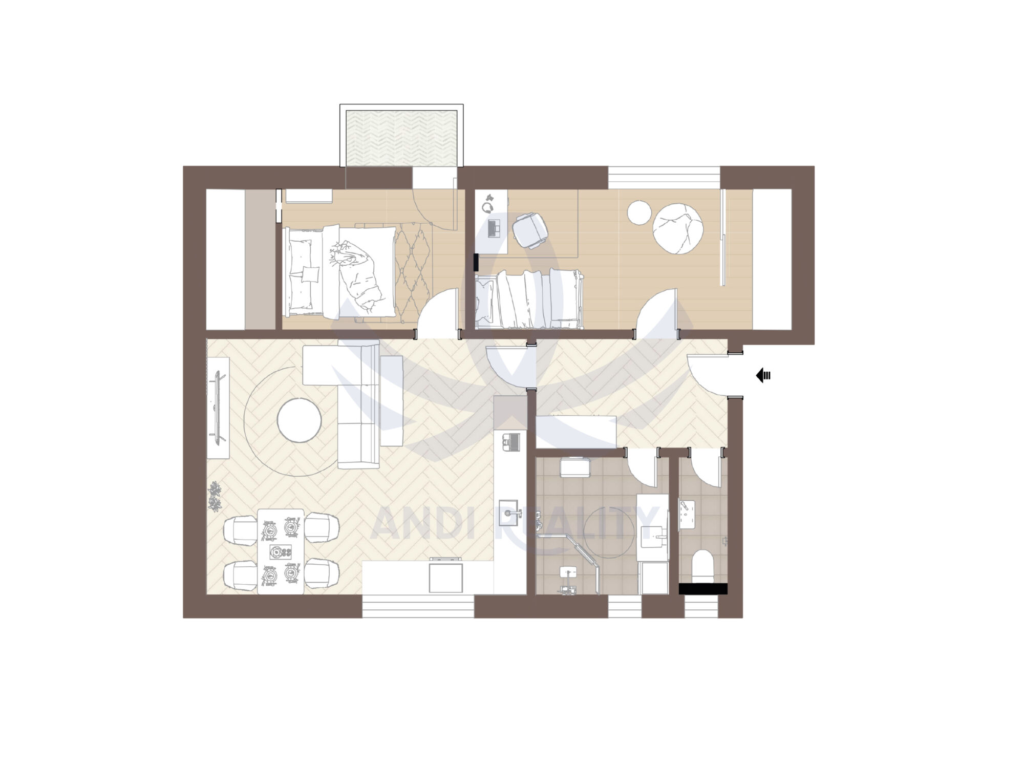 Světlé pokoje, dostatek místa a klidná barevnost. Prosluněná ložnice i obývací pokoj. Bezpečnostní dveře pro pocit jistoty.