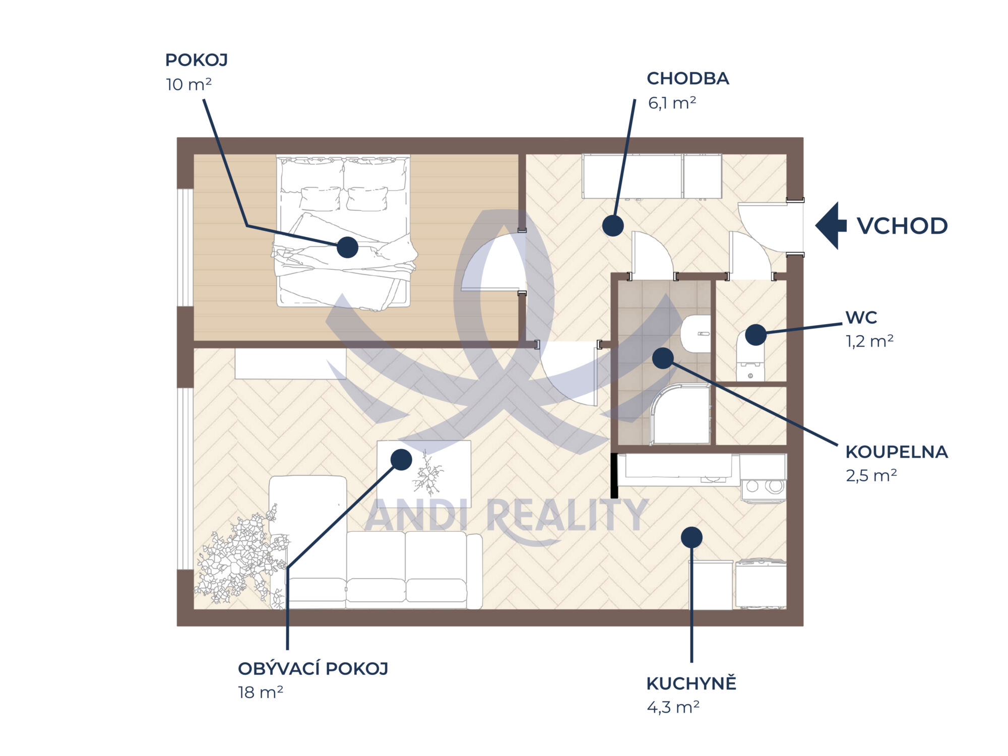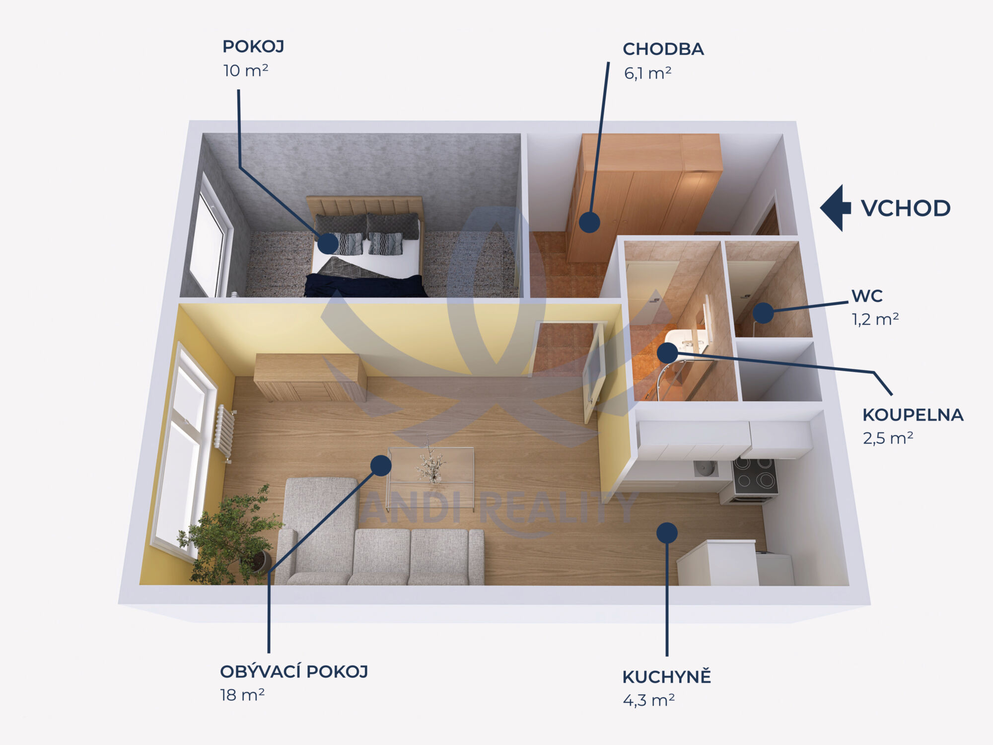 • Dispozice 2+KK, výměra 44,7 m².