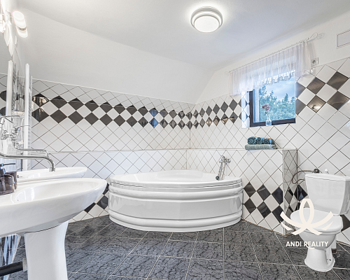 Koupelna v patře s rohovou vanou, umyvadlem, zrcadlem i koupelnovou skříňkou dohromady s toaletou.